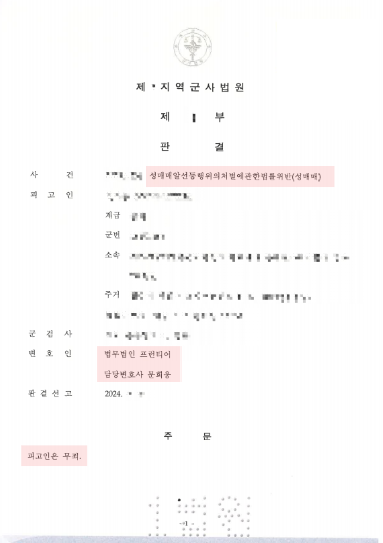군사법원은 최종적으로 저의 주장을 받아들였습니다. 군검찰이 제출한 증거만으로는 피고인이 실제로 성매매 행위를 했다고 단정하기 어렵다고 판단했습니다. 결국 재판부는 범죄의 증명이 없다는 이유로 무죄를 선고했습니다.